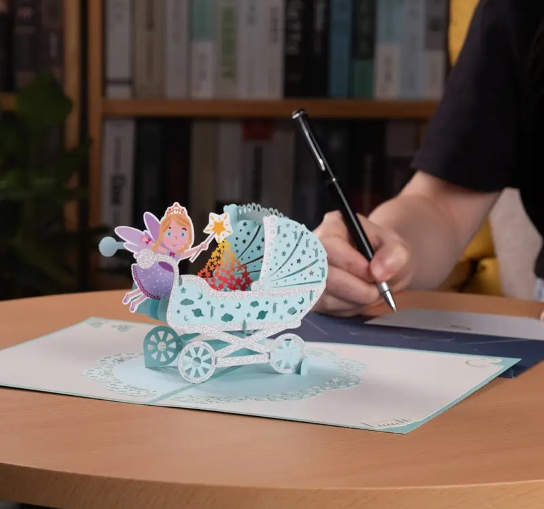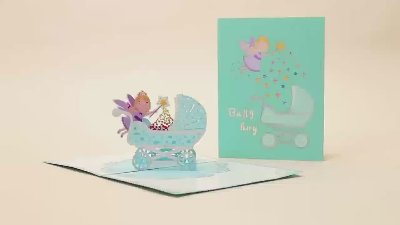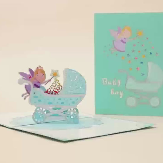 Beautifully crafted New-born Boy Pop Up Greeting Card with Buggy (Stroller) Fairy Design (Baby Shower)